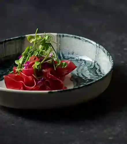 Med Raku bringer Churchill en nutidig fortolkning af den traditionelle reaktive glaseringsproces. Hver del får sit helt eget levende udtryk, hvor glasurens spil og dybde gør hver servering unik og fuld af energi.