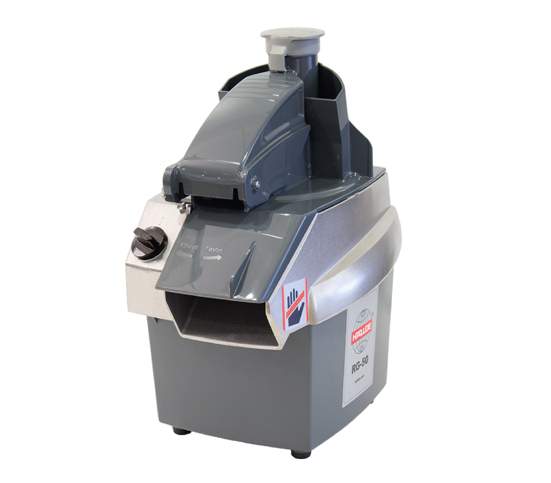 Sikkerhed og Brugervenlighed: Med en automatisk start- og stopfunktion stopper RG-50, så snart skubberpladen er svinget op, og genstarter, når den svinges tilbage. Denne funktion er særligt nyttig, når man arbejder med større mængder, hvilket øger både sikkerhed og effektivitet i køkkenet.