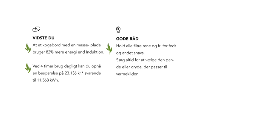 Fordelen er, at det kun er arealet under gryden, der bliver varmet op. Denne type komfur er særdeles energieffektivt. Godt nok er det dyrere i indkøb, men der er ikke kun en energi- mæssig gevinst. Induktionskomfuret udleder mindre varme, og påvirker dermed ikke indeklimaet som andre komfurer, hvor det kan være nødvendigt med ekstra udsugning og indblæsning af luft, hvis det kører rigtig meget.