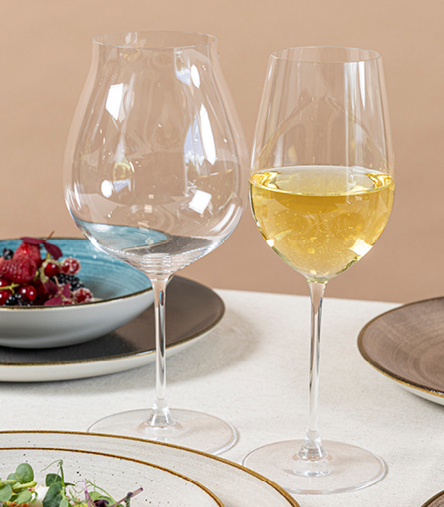 De alsidige glastypeformer til rød- og hvidvin er designet til at øge drikkeoplevelsen for gæsterne, mens de robuste, en smule kortere stilke gør servering og opbevaring nemmere og mere effektiv i en travl restaurant- eller cateringhverdag.