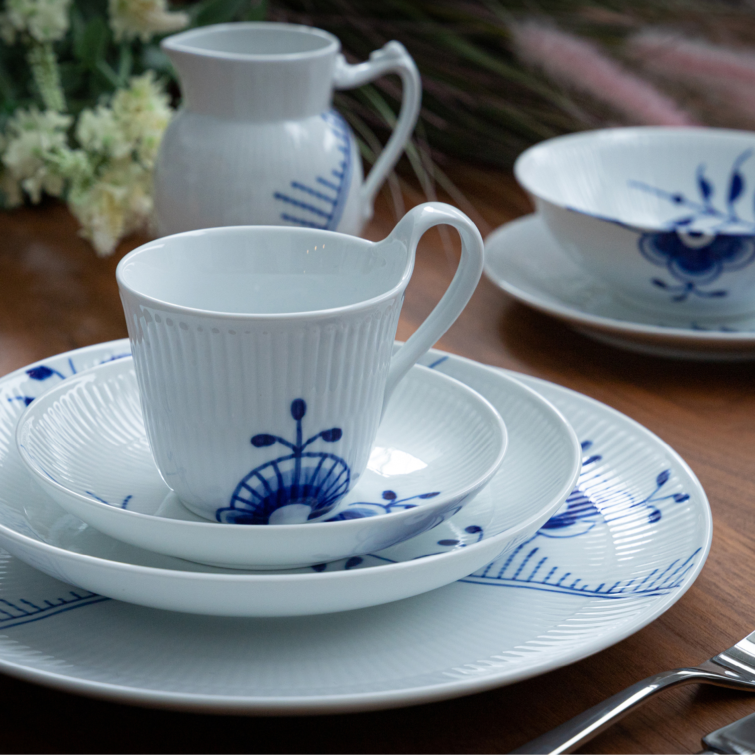 På Blå Mega Riflet er det velkendte blomstermønster fra Musselmalet Riflet fortolket på nye og overraskende måder og på charmerende vis forstørret i hvert stykke porcelæns unikke, håndmalede mønster.