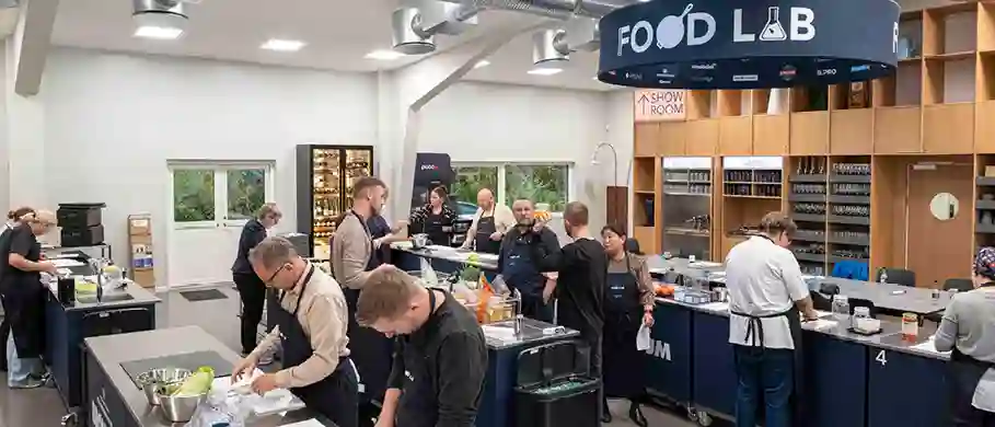 Med vores nye Food Lab i Aarhus får vi også bedre muligheder for at afholde kurser, temadage og skræddersyede arrangementer for vores kunder og samarbejdspartnere i Jylland og på Fyn. Det bliver et dynamisk sted, hvor fagfolk mødes, lærer og udvikler sig sammen.