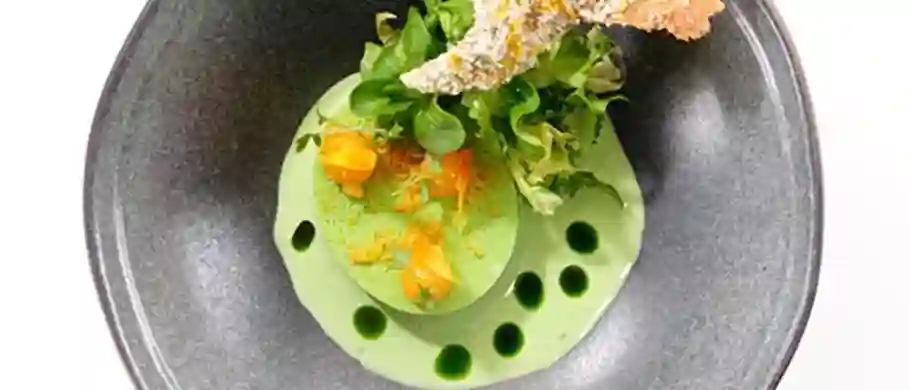 Udblød gelatinen og varm fløden til 50 °C, tilsæt feldsalat og sur creme. Opløs gelatinen og fold den ind. Krydr blandingen, lad den køle let af og hæld den i en pacotizing®-bæger.