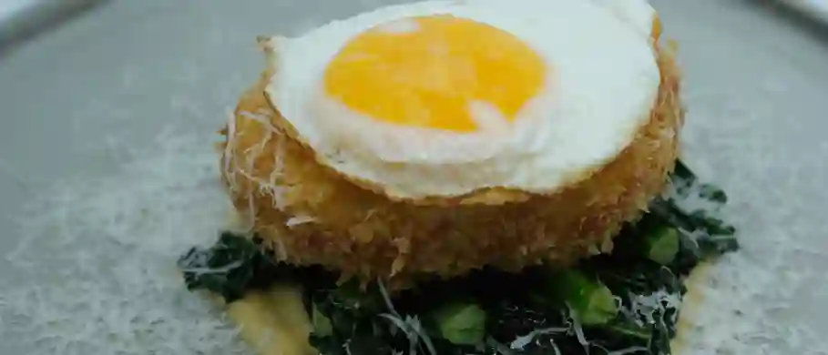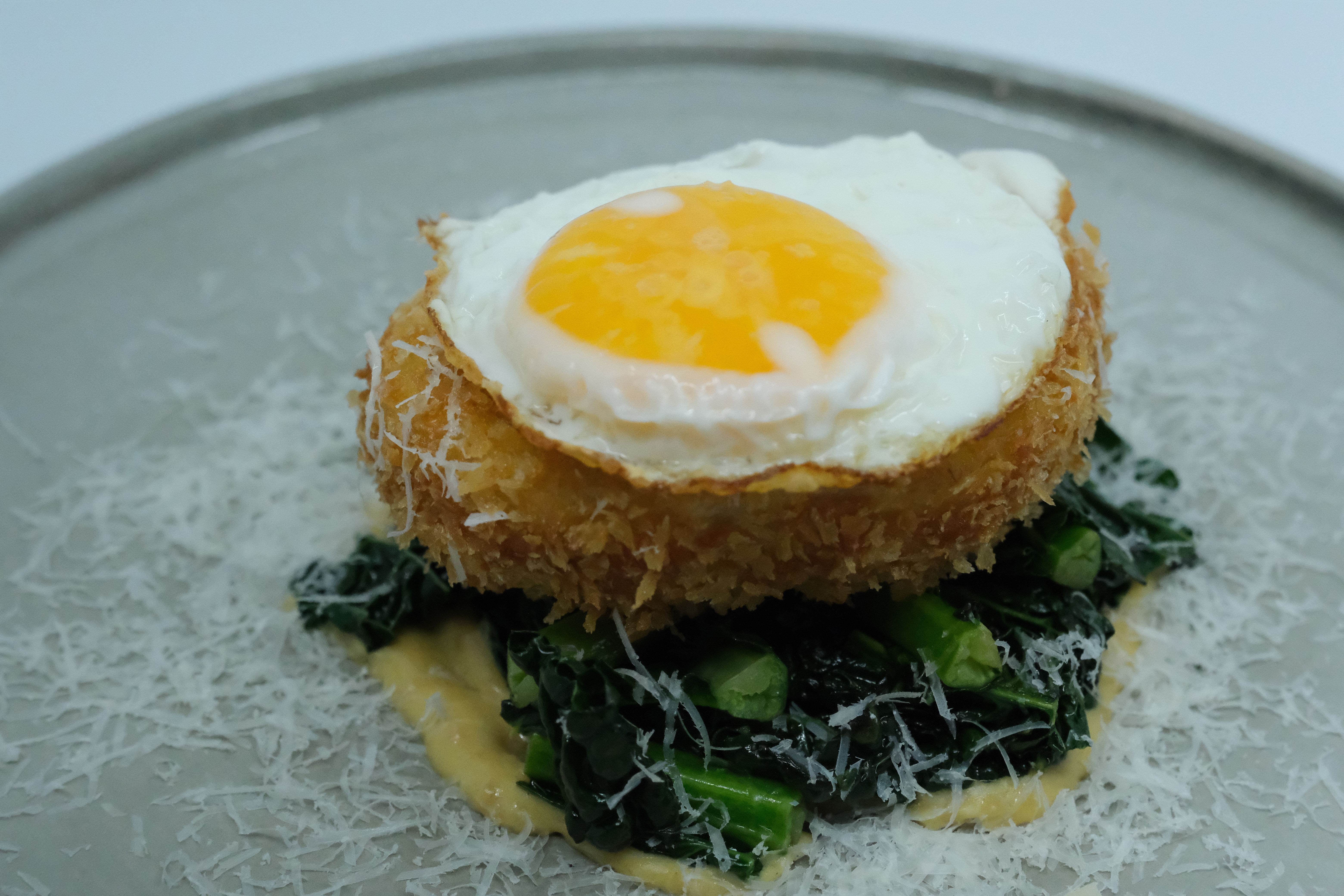 "3 Gode med Selleri" Selleri i Panko med palmekål, lagret ost, spejlæg og sennepsvinaigrette