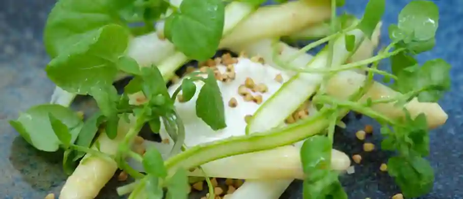 Dryp cruditeerne af og anret dem rundt omkring de hvide asparges og færdiggør med lidt brøndkarse.