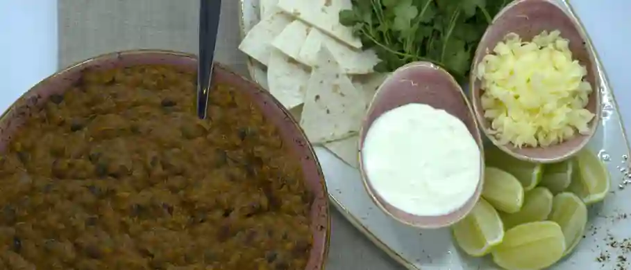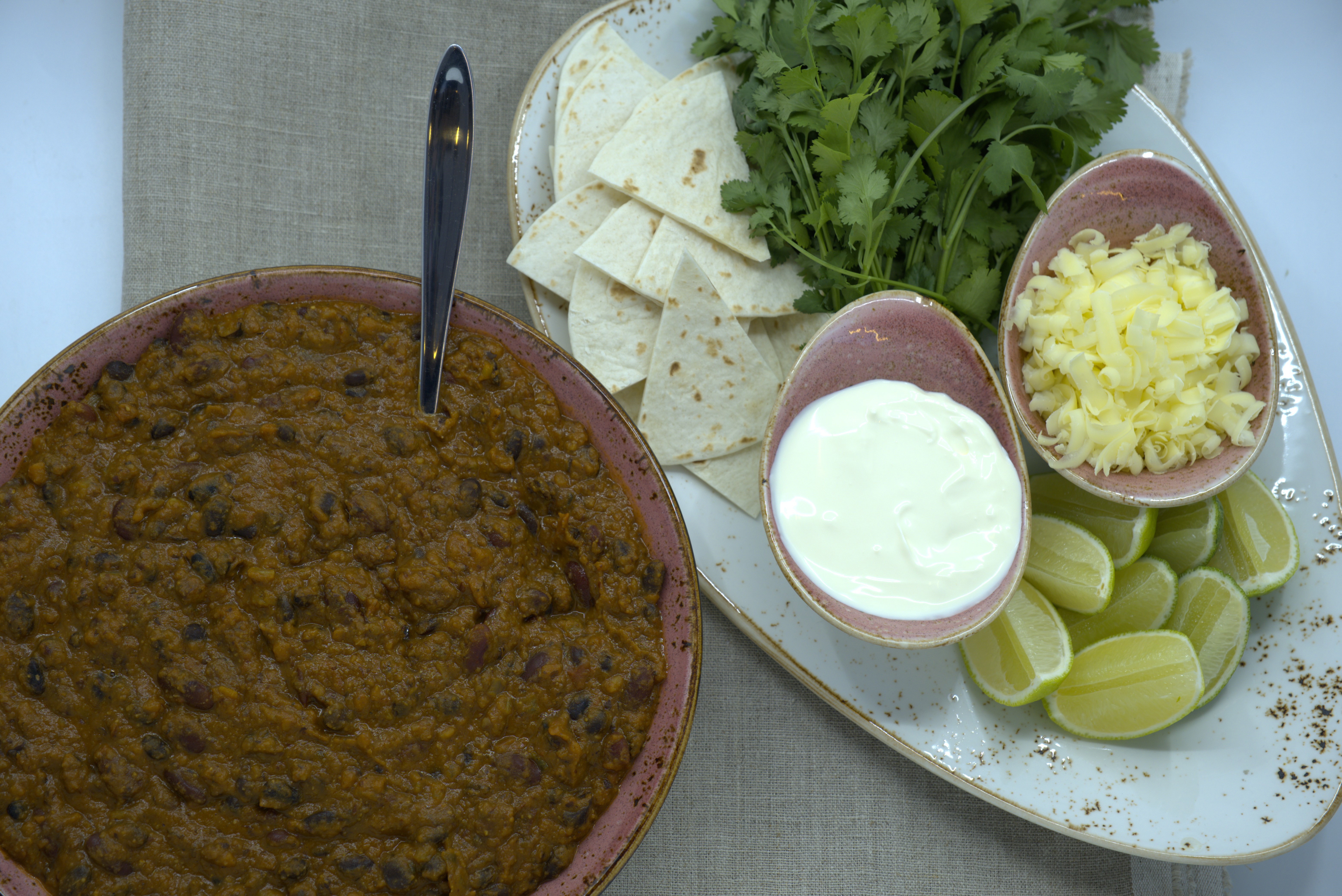 Server Chili sin Carne med Creme Fraiche, friske koriander, lune hvedemelstortillas, revet cheddar og lime.