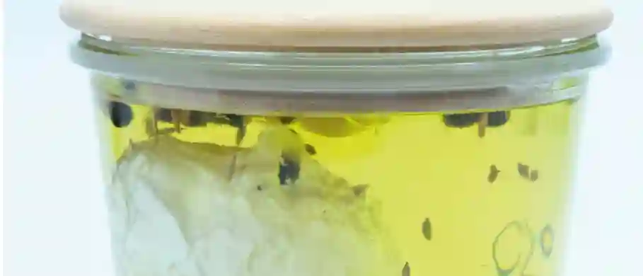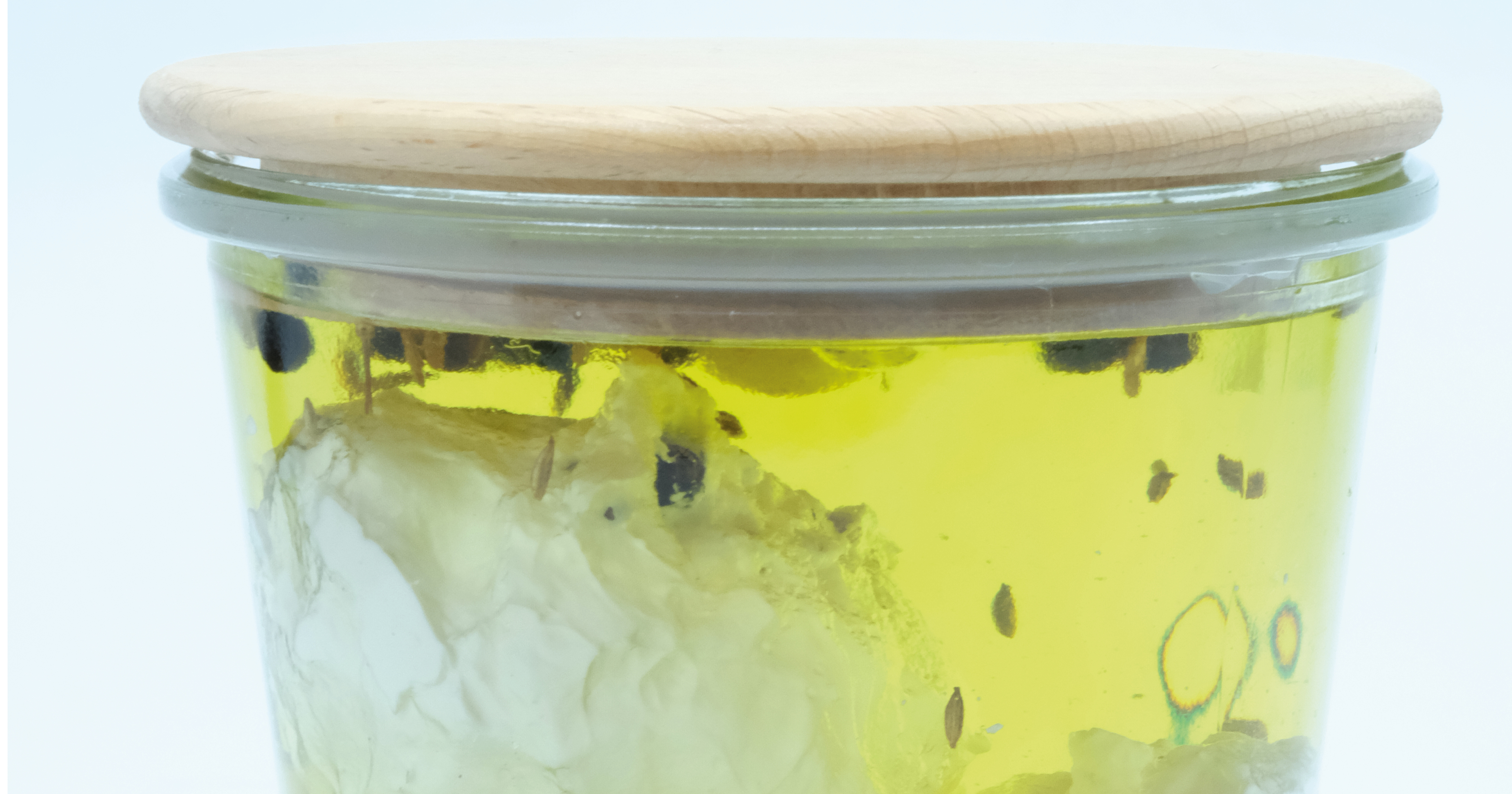 Form yoghurten til kugler af ca. en golfboldsstørrelse og læg i patent glas eller boks og overhæld med olien. Det er vigtigt at olien dækker yoghurten helt.