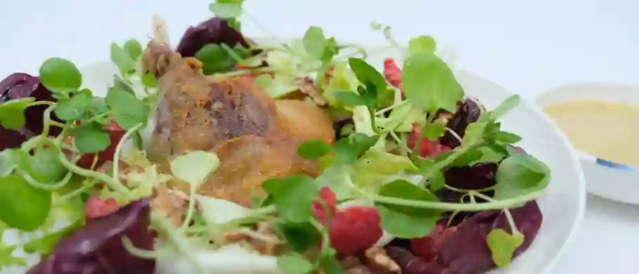 Anret det lune sprøde andelår i midten og server vinaigrette ved siden af.