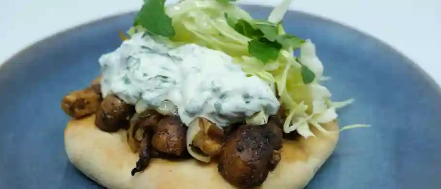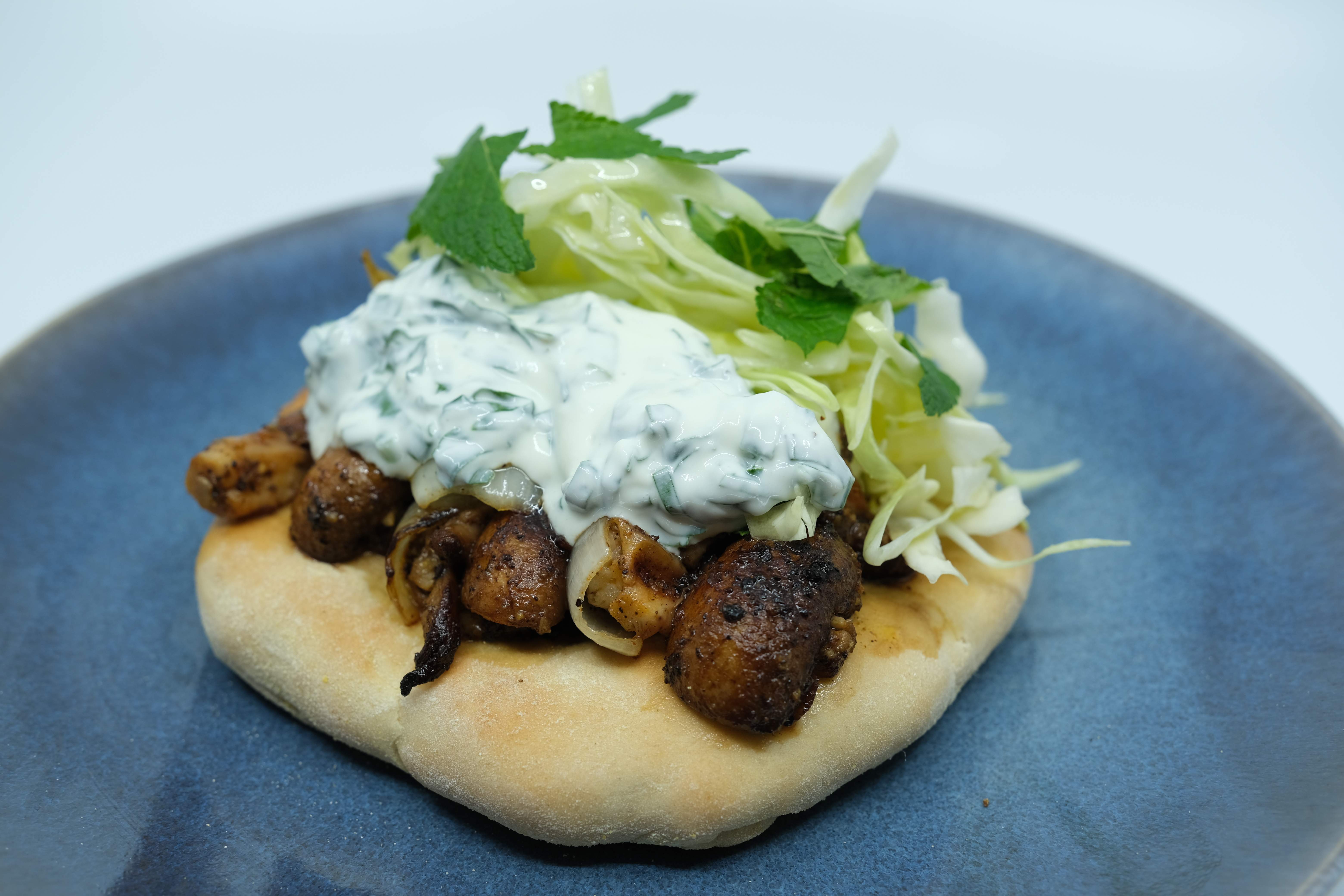 "Det grønne hjørne Vol 2" Svampekebab med pitabrød og Ramsløgsyoghurt