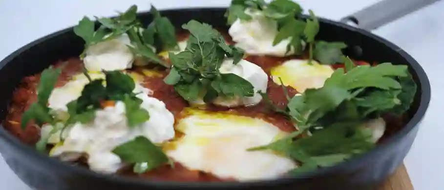 Bag Shakshuka ved 160 grader i 6-8 minutter. Målet er en fast æggehvide med cremet blomme.