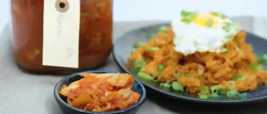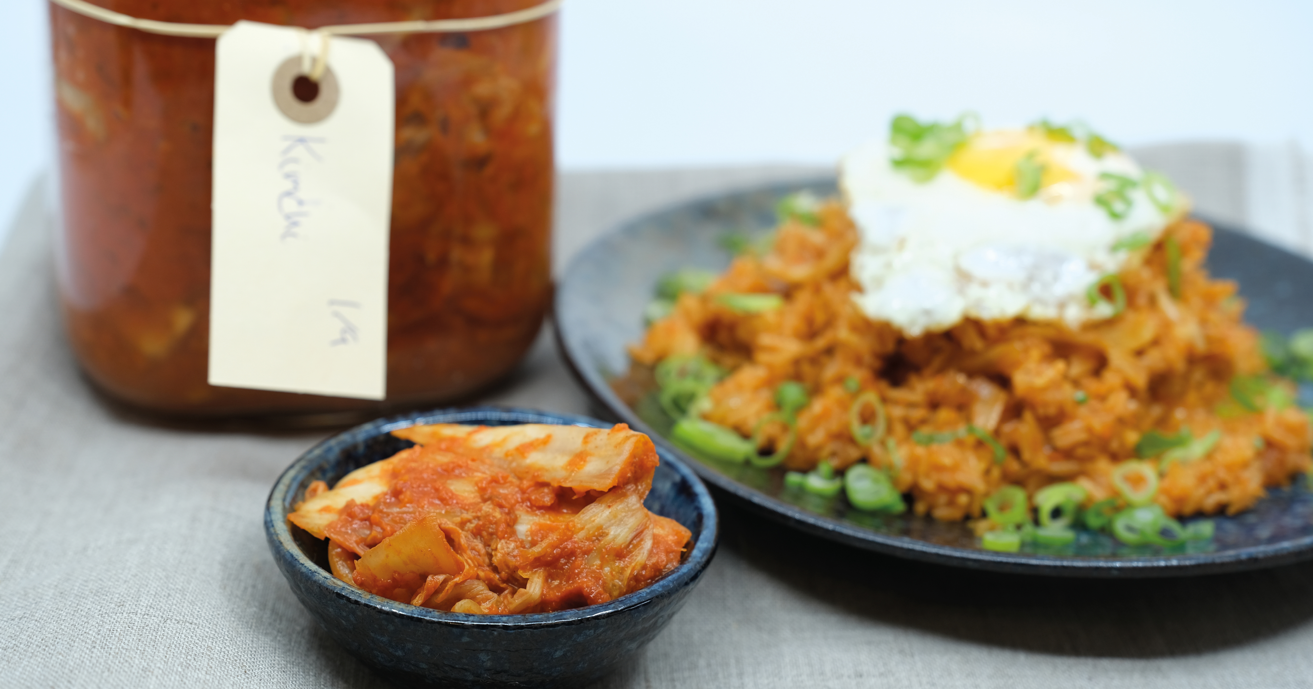 Prøv som på billedet at stege rester af ris i rigeligt olie, tilsæt hakket Kimchi og server med spejlæg og snittet forårsløg.