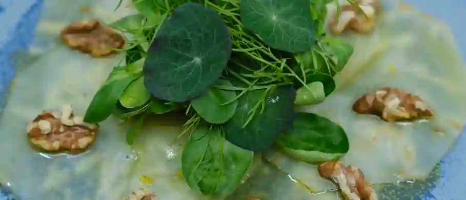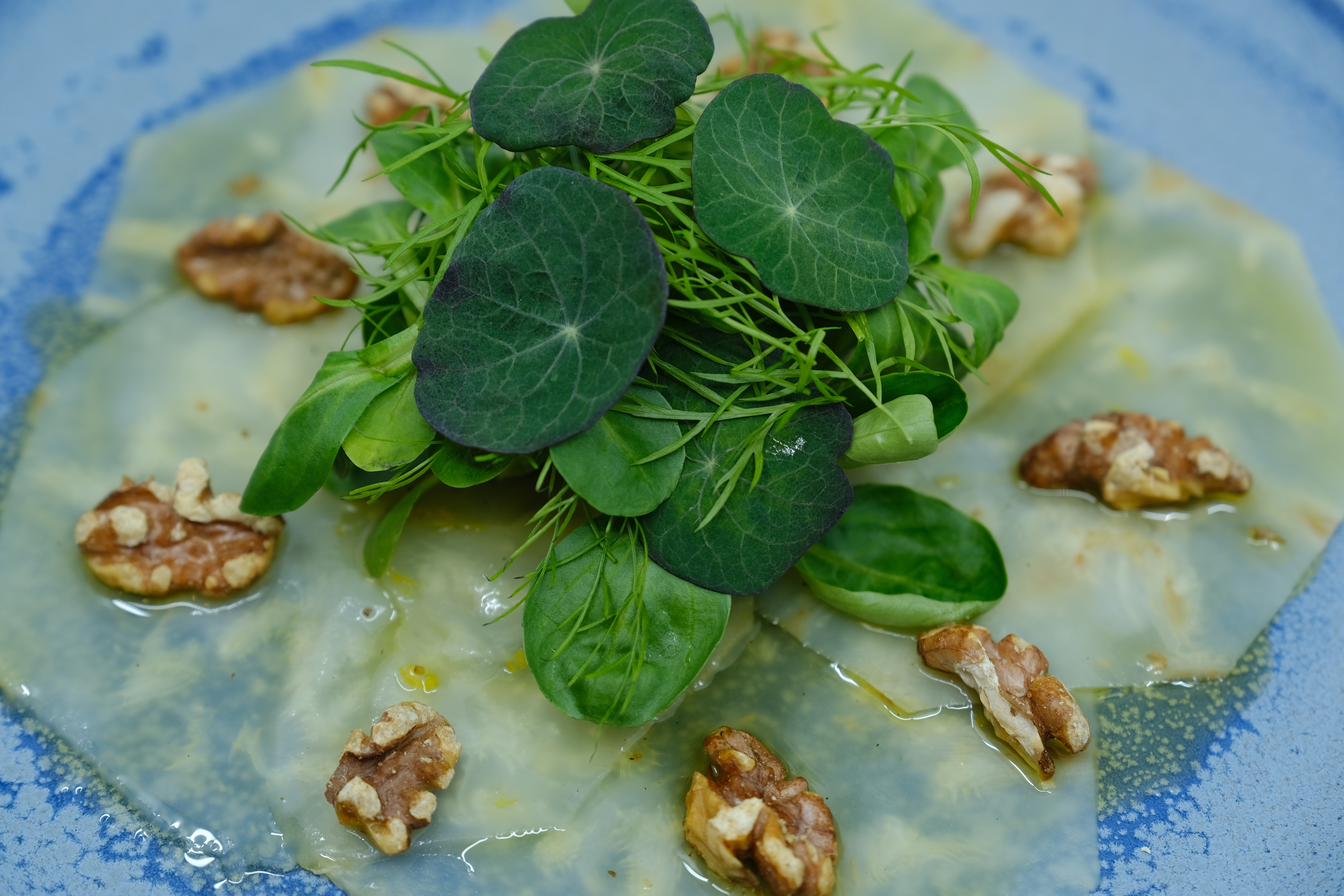 Skær skrællen af det bagte selleri og skær skiver af ca. 2 mm og fordel et tyndt lag ud på 4 tallerkener.