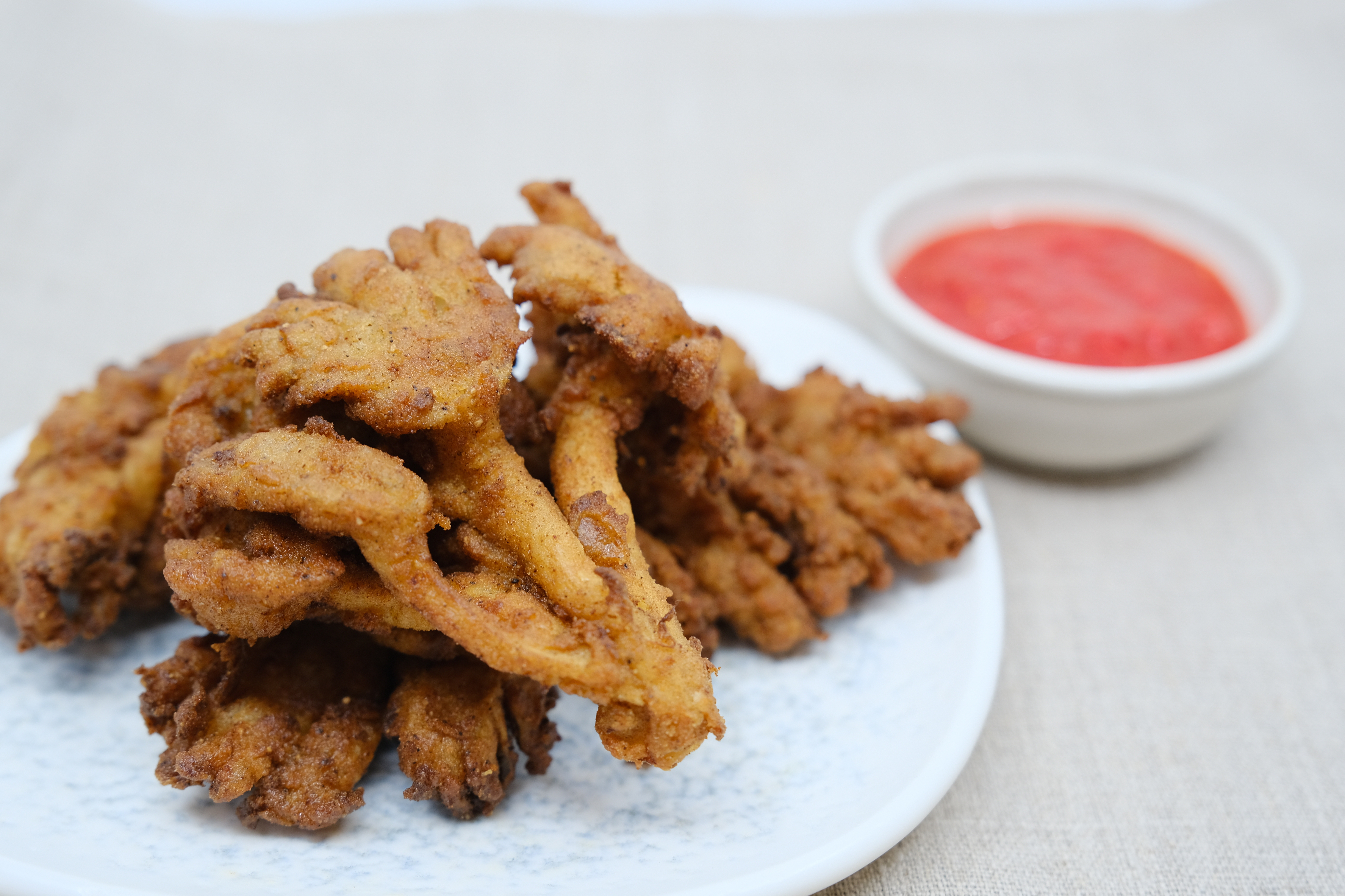 Dryp svampene af på en rist og krydder med fint salt og server straks med din favorit chilisauce.