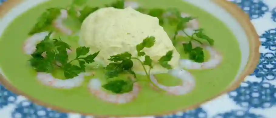 Anret rejerne rundt om og anret en god stor skefuld karryfløde i midten.