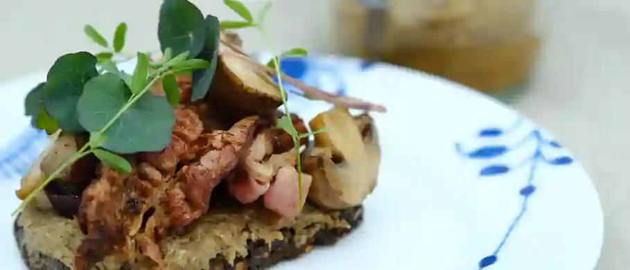 Dræn Shiitake grundigt og steg dem i 30 g olie til de får en stegt farve. Køl af.