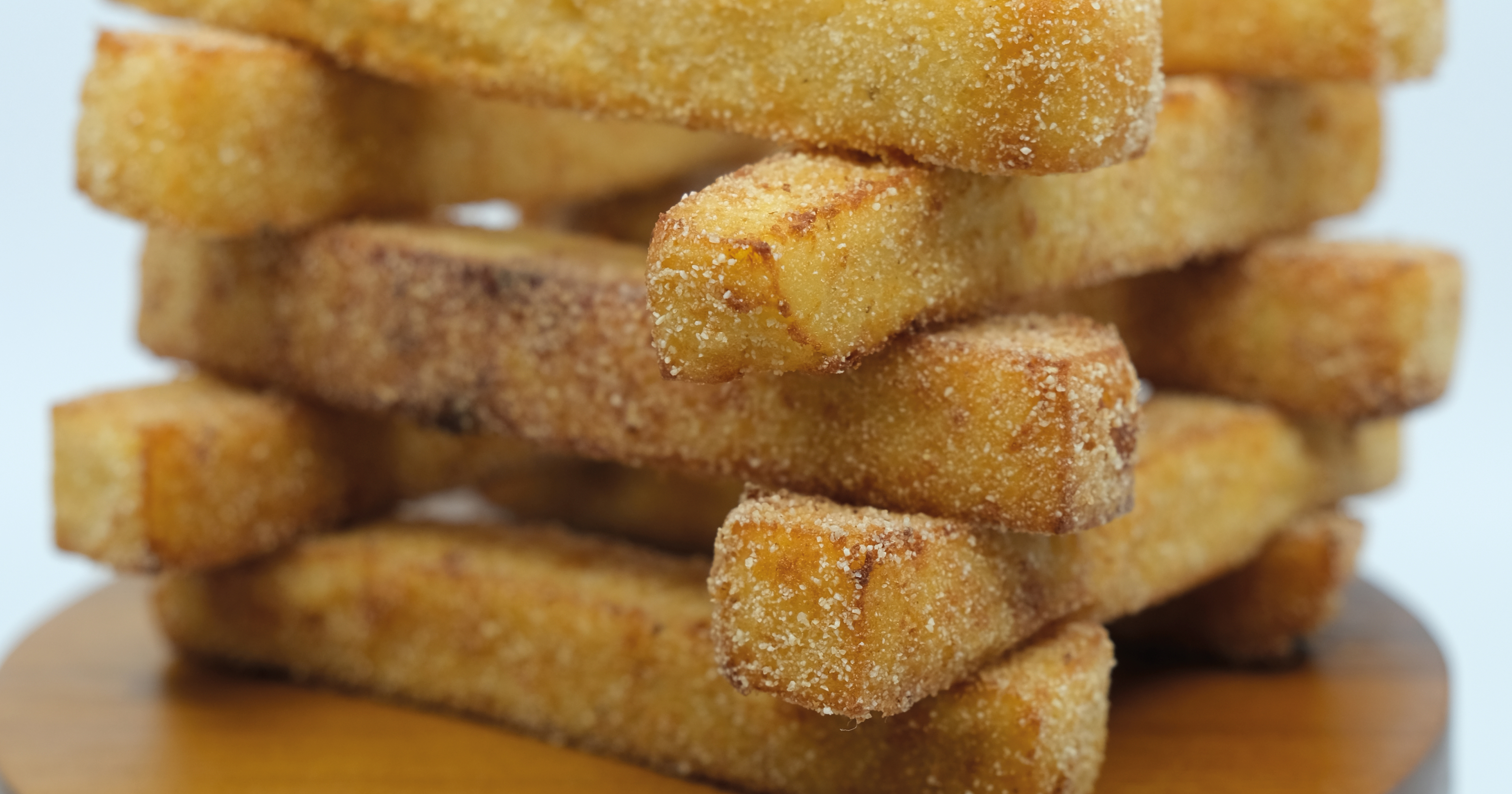 Skær den nu i i bjælker eller skiver alt efter hvad du synes, vend dem i semulje og friter ved ca. 170 grader til de er gyldne og sprøde.