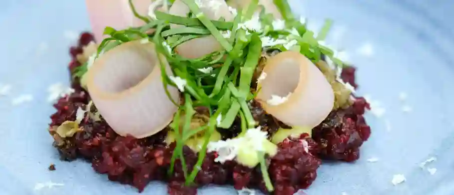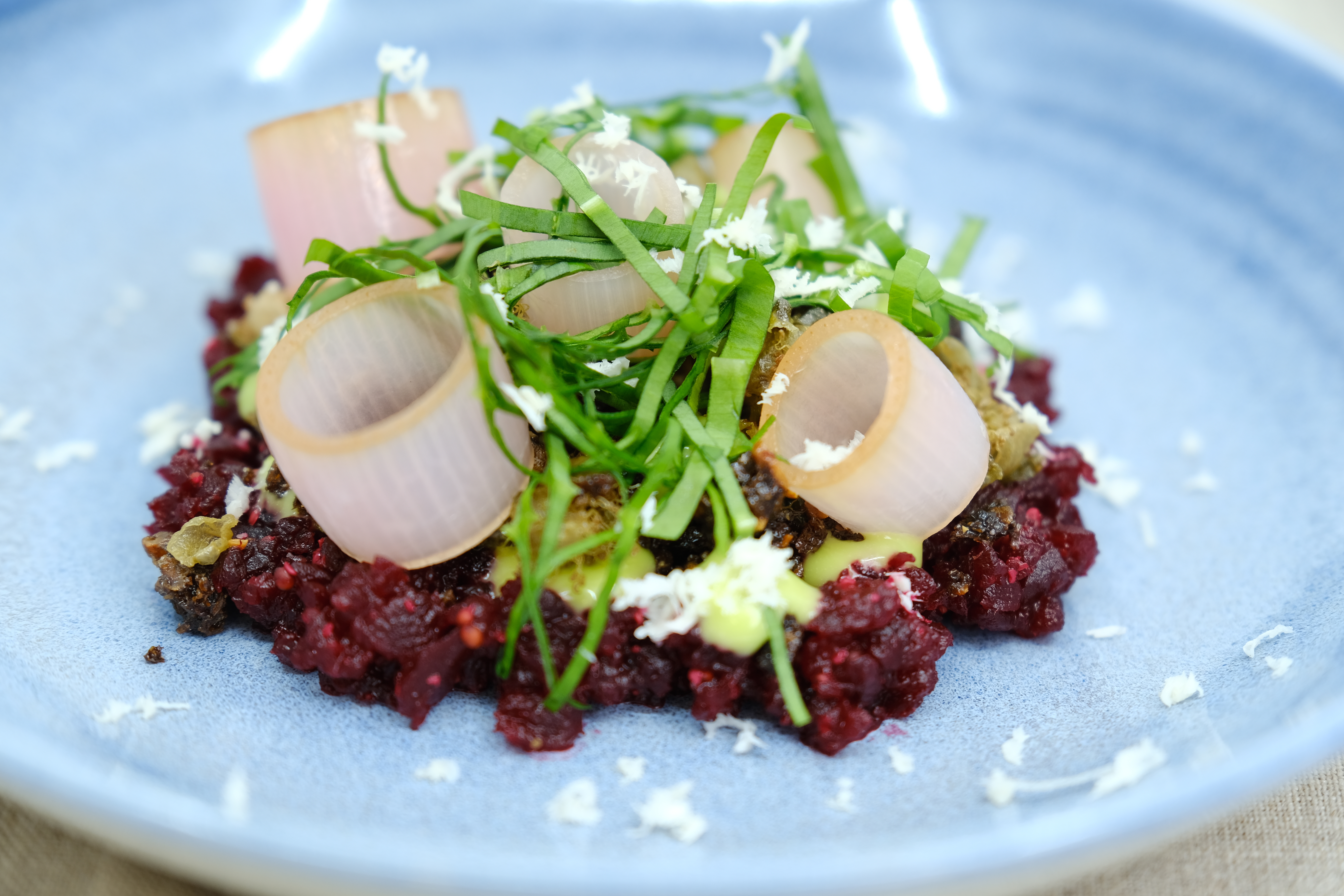 Drys med kapers, rug crumble, ramsløg og riv peberrod fint på Micro Plain ud over.