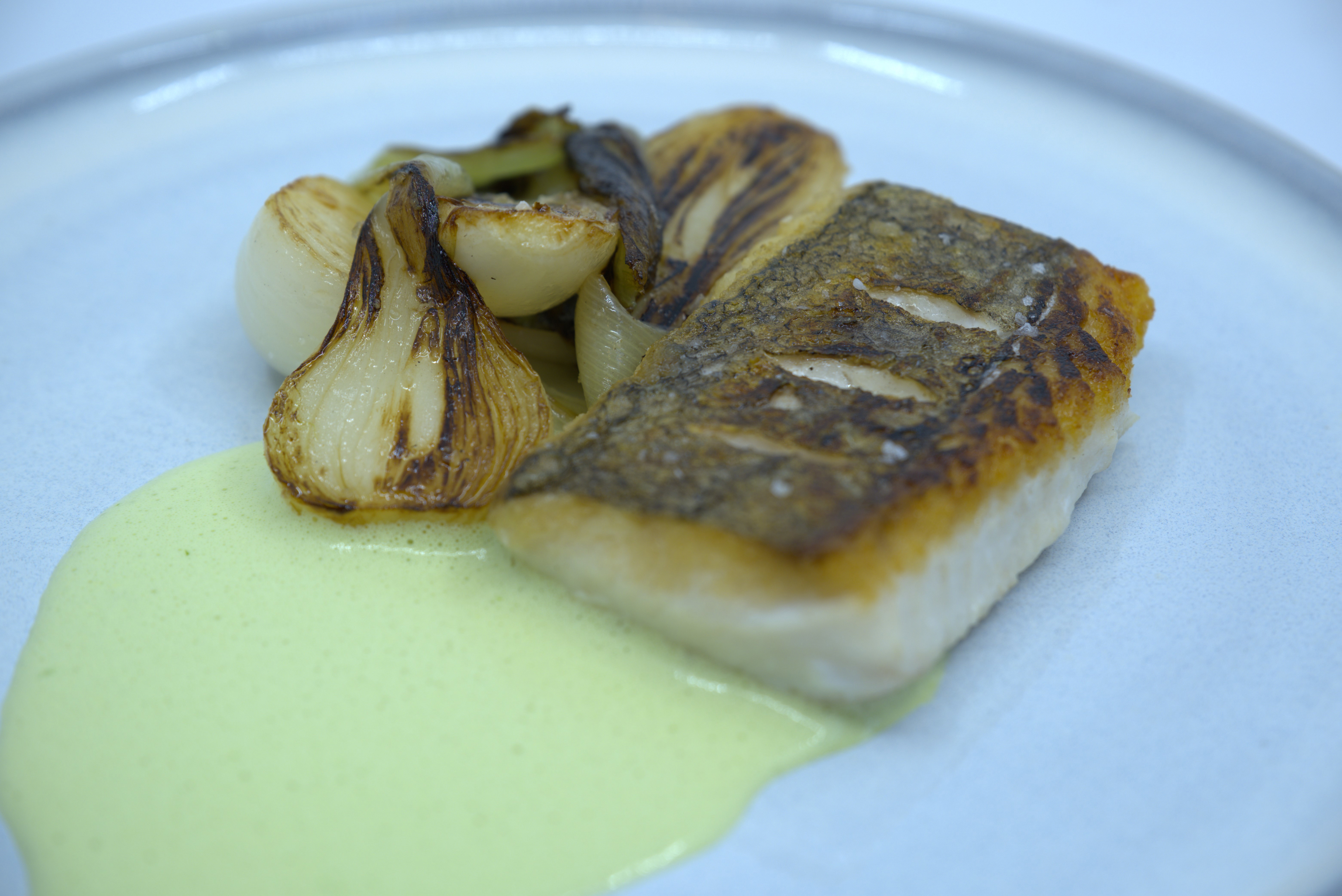 Anret løgene, den friskstegte fisk og saucen på en tallerken og server straks.