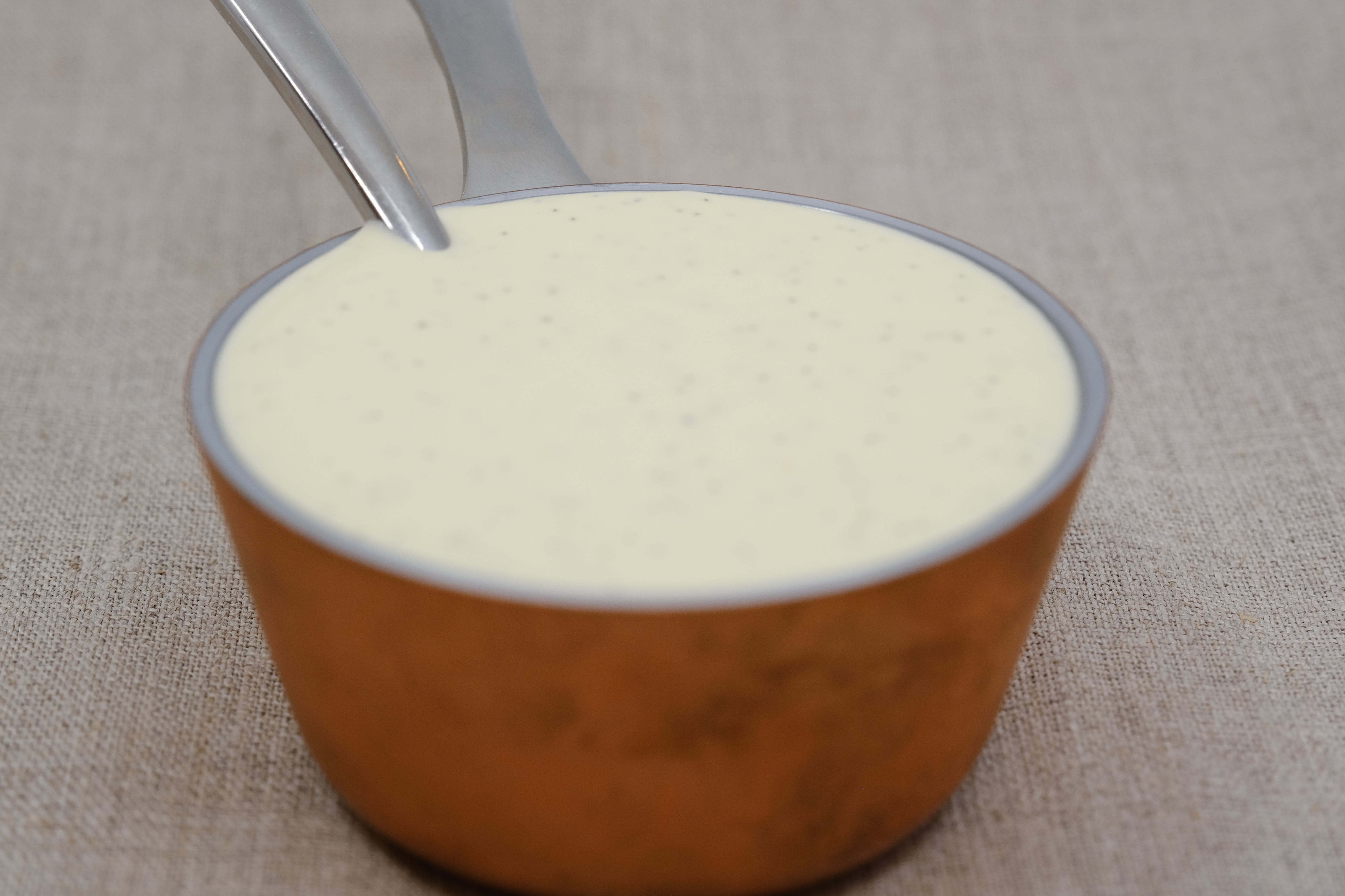 Skrab vanilje kornene ud af stængerne og tilsæt vaniljen, sukker og fløden i en gryde og kog den op og køl den let af.