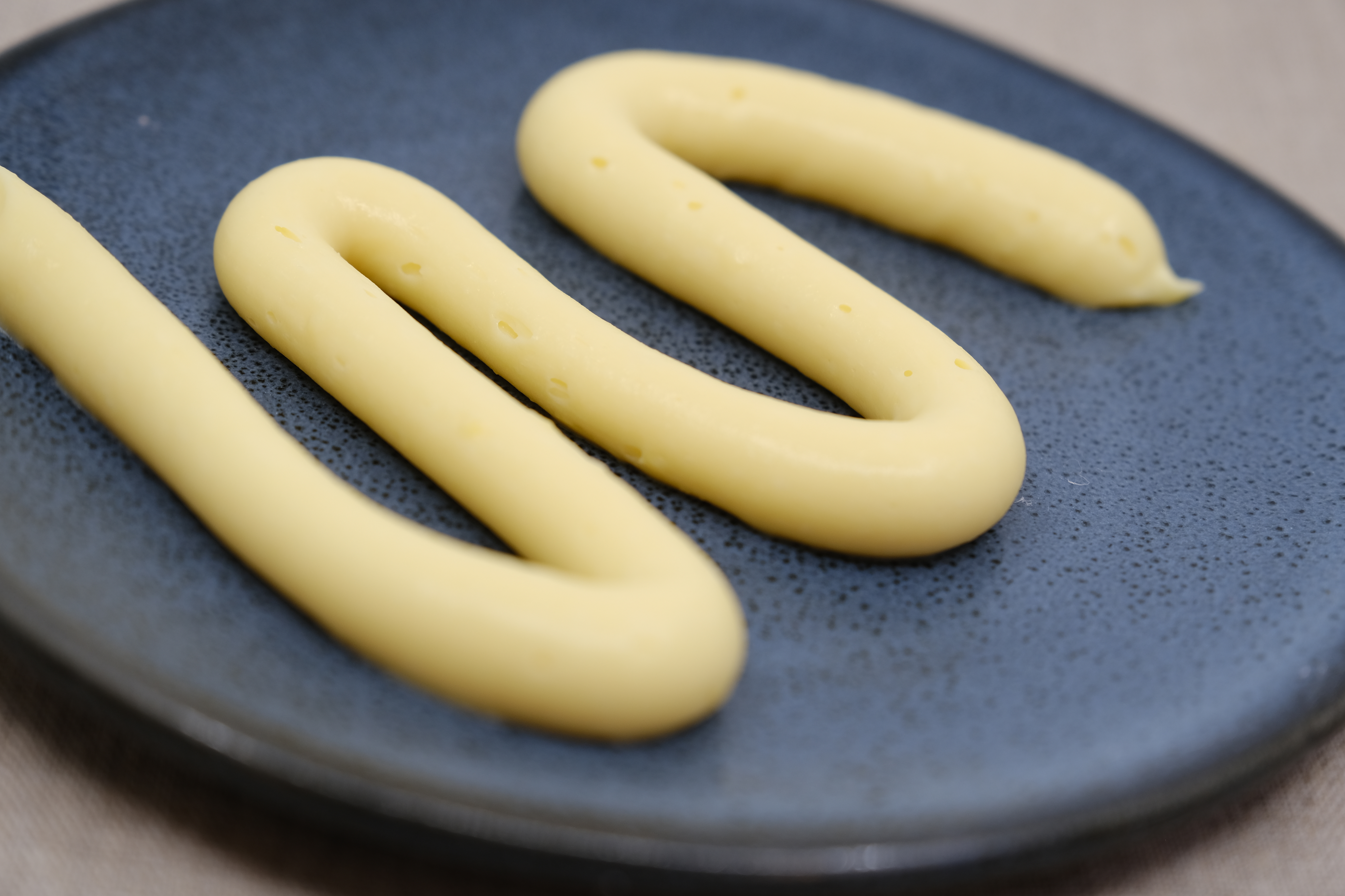Start med at udbløde gelatinen i koldt vand og skær smørret i små tern og stuetemperer det.