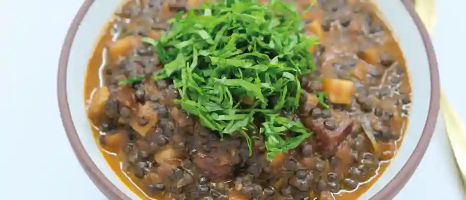 Start med at skylle linserne og kog dem stille og roligt op i vand med salt, med de 100 g løg og 30 g hvidløg (Disse skal bare være hele hvidløg og halveret løg)