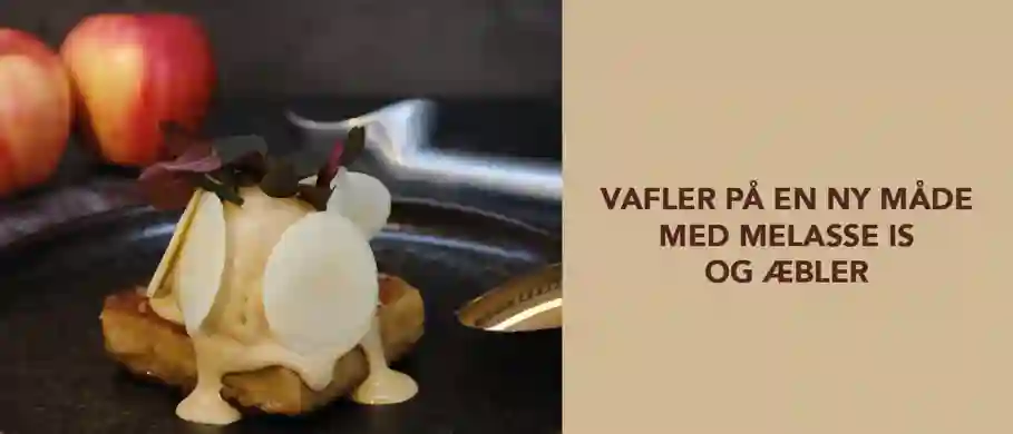 Anret vaflen på tallerkenen mens den stadig er varm, og kør isen på pacojet og anret en god kugle is ovenpå, top med æble rundeller og godt med plukket syre.