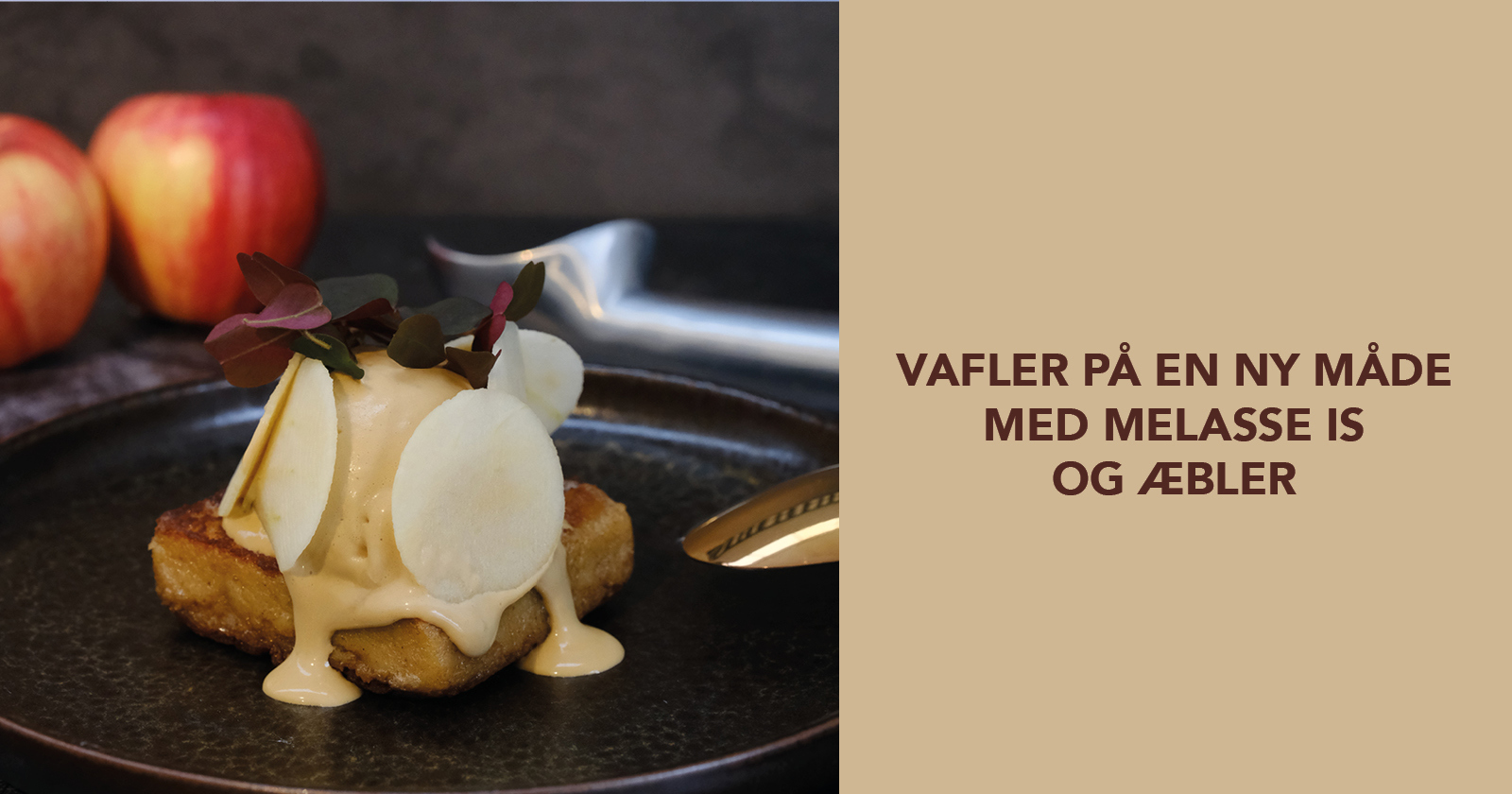 Anret vaflen på tallerkenen mens den stadig er varm, og kør isen på pacojet og anret en god kugle is ovenpå, top med æble rundeller og godt med plukket syre.