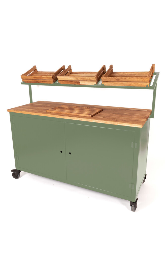Barbera Mobil Buffet Pale green mat. Buffetvogn med træbordplade, skab med 2 låger og en top hylde der passer til 3 Gastro trækasser. Buffetvognen har 4 hjul, hvor af de 2 kan låses. Barbera Mobil Buffet vognen er lavet i nordisk egetræ og pulverlakeret jern.