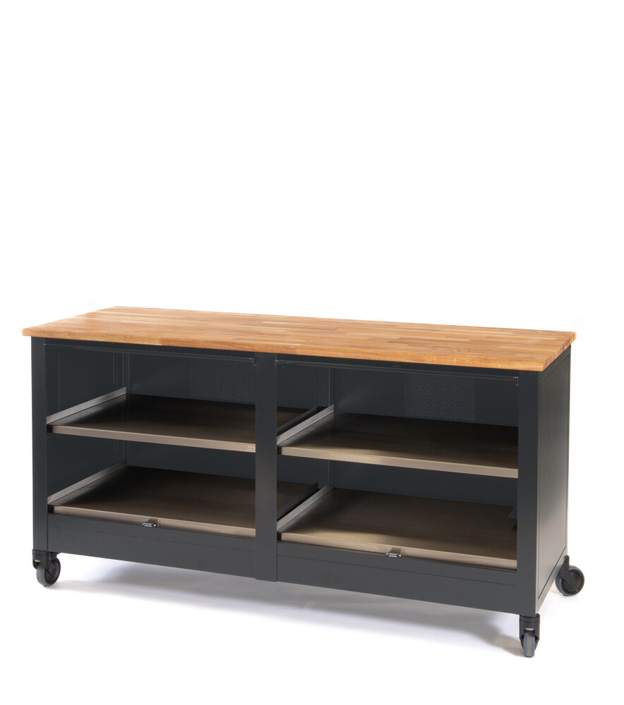 Betty Mobile Buffet Anthracite mat. Buffetvogn med træbordplade 2 skabe med 4 stærke stål hylder. Buffetvognen har 4 hjul, hvor af de 2 kan låses. Betty Mobile Buffet vognen er lavet i nordisk egetræ og pulverlakeret jern.
