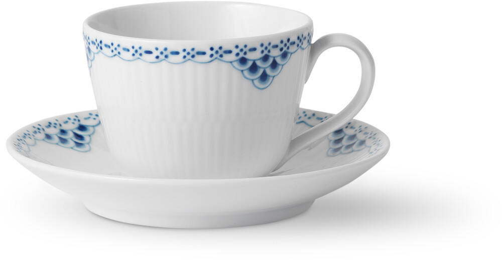 Royal Copenhagen Prinsesse Kop og underkop 20 cl. Prinsesse-stellet har et håndmalet raffineret mønster i Royal Copenhagens karakteristiske blå farve, som giver stellet en smuk blondekant. Den feminine blonde og de blå fiskeskælsdekorationer på Prinsesse-stellet afslører et tæt bånd til de musselmalede stel, men alligevel er det feminine stel helt sit eget. Stellet var oprindeligt et testel, men i 1978 blev Prinsesse stellet til et fuldt middagsstel. Det fine Prinsesse stel er smukt i sig selv og i kombination med andre af Royal Copenhagens stel.