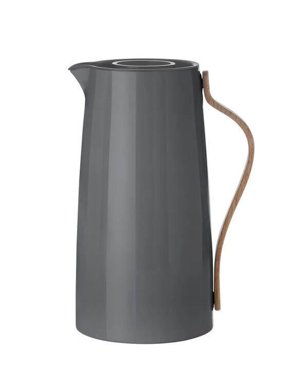 Stelton Emma Termokande Grey. Kanden har et moderne, skandinavisk look, med lakeret stål i en smuk grå farve og en elegant buet hank i bøgetræ. Med et enkelt klik på låget er kanden åben, hvilket gør at kanden er let at betjene med én hånd. Emma Termokanden har stålindsats og kan indeholde 1,2 l.