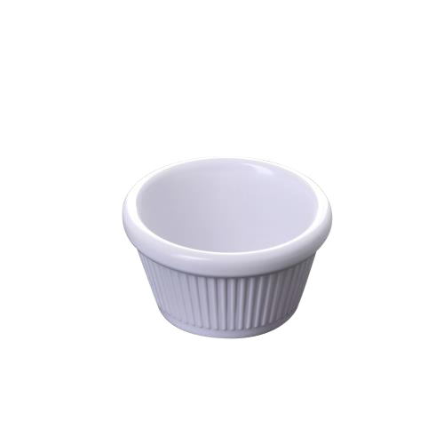 Buffet-line Ramekin 7 cm. Ramekin i hvid melamin med rifler. Melamin er en praktisk og let plast med en høj brudsikkerhed. Produkter i melamin er velegnede til opvaskemaskine, men brug ikke melamin i mikroovn, ovn eller på varmeplader.