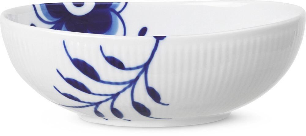 Royal Copenhagen Blå Mega Riflet Oval skål 37 cl. Blå Mega Riflet er en forfriskende nyfortolkning af det ikoniske Musselmalet stel fra 1775. På Blå Mega Riflet er det velkendte blomstermønster fra Musselmalet Riflet fortolket på nye og overraskende måder og på charmerende vis forstørret, hvilket giver hvert stykke porcelæn et unikt, håndmalet mønster. Siden Blå Mega Riflet blev designet i 2000 af Karen Kjældgård-Larsen for Royal Copenhagen, er stellet blevet solidt forankret i Royal Copenhagens arv og en ny klassiker inden for dansk design. Det moderne stel er smukt i sig selv og i kombination med andre Royal Copenhagen stel.