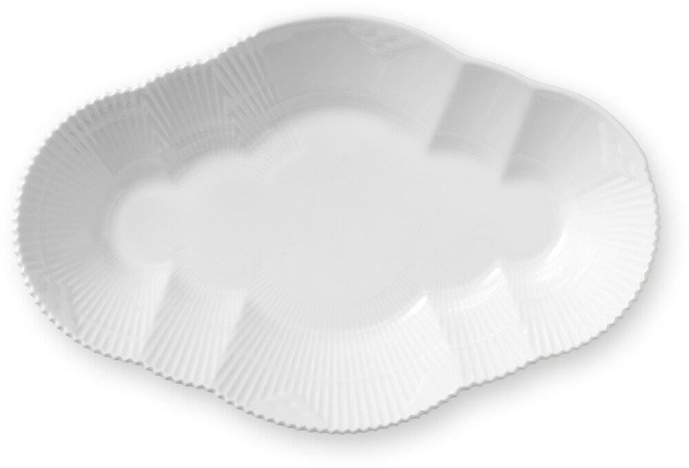 Royal Copenhagen Hvid Elements Fad 23 cm. Hvid Elements blev skabt i 2008 af Louise Campbell for Royal Copenhagen. Hvid Elements er som navnet hentyder skabt af en charmerende kombination af designelementer fra Royal Copenhagens mest klassiske stel. Stellet er en legende sammensætning ikoniske elementer som håndudskårne rifler, den fine blondekant fra Musselmalet Halvblonde og den takkede kant fra det ekstravagante stel Flora Danica. Stellet er smukt i sig selv og i kombination med andre stel fra Royal Copenhagen.