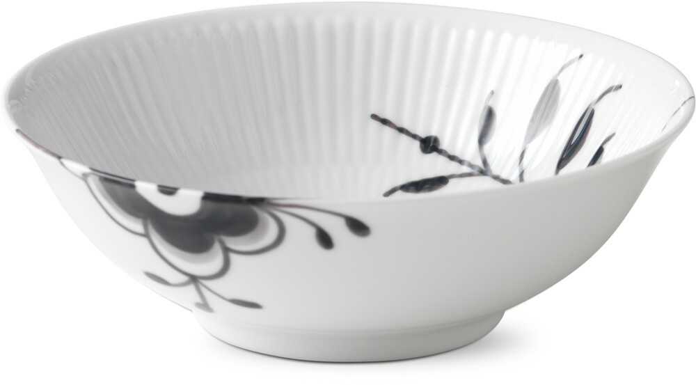 Royal Copenhagen Sort Mega Riflet Skål 35 cl. Sort Mega Riflet er et smukt bevis på, at selv de mest klassiske traditioner kan tåle at blive udfordret. På Sort Mega Riflet er det velkendte mønster fra Musselmalet Riflet fortolket på nye og overraskende måder det forstørrede blomstermønster får et moderne og skarpt udtryk med de håndmalede sorte og grå nuancer. I Royal Copenhagens blå univers er Sort Mega Riflet et strejf af sofistikeret coolness. Stellet blev skabt i 2006 af Karen Kjældgård-Larsen for Royal Copenhagen. Det moderne stel er smukt i sig selv og i kombination med andre af Royal Copenhagens stel.