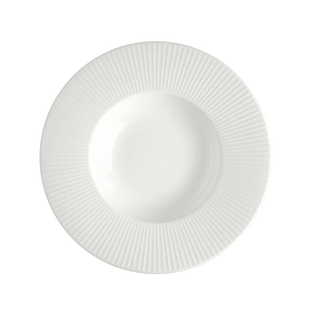 Steelite Willow Dyb Tallerken 31,5 cm. Willow er en smuk stelserie, med et elegant og stilrent udtryk. De karakteristiske rifler giver stellet moderne kant og et unik look. Willow har et stort udvalg af smukke produkter i enkelt design.Steelite er anerkendt verden over for deres stærke porcelæn i høj kvalitet hvilket betyder at de tilbyder livslang kantskårsgaranti, på alt deres Steelite porcelæn.