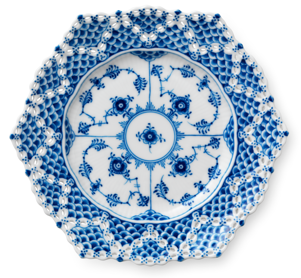 Royal Copenhagen Musselmalet helblonde Tallerken med roset 21 cm. Musselmalet helblonde blev skabt i 1775 og revideret i 1885 af kunstnerisk leder Arnold Krog. Stellet er blandt Royal Copenhagens mest ekstravagante stel, med sine mange smukke detaljer demonstrerer stellet porcelænshåndværk på højeste niveau. Kantens smukke blonde er udskåret i hånden og derefter dekoreret med håndmalede dekorationer i Royal Copenhagens ikoniske blå farve, for at skabe det unikke, flettede porcelænsmønster. Steller er Smukt i sig selv eller i kombination med et eller flere af Royal Copenhagens stel.
