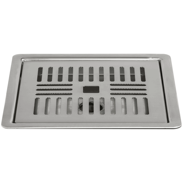Kvadratisk drypbakke i rustfrit stål med afløb til indbygning.