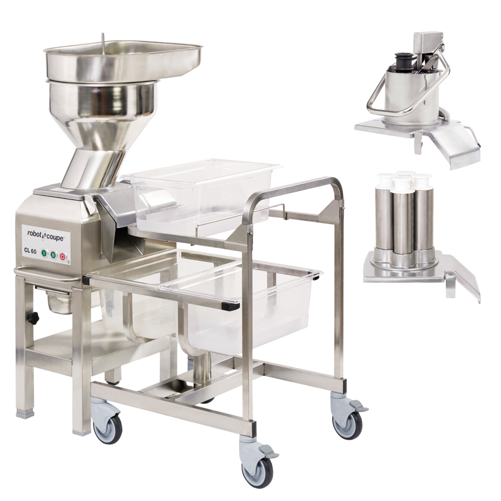 Robot Coupé CL 60 Komplet arbejdsstation er en grøntskærer udviklet til den store produktion, med høje krav til både effektivitet, resultat og præsentation. Gulvmodel inklusive manuel nedstopper, automastisk fødetragt, understel, 4-huls nedstopper, vogn til grøntskærer med plads til 3 GN kantiner, MultiCut skivepakke med 16 forksllige skiver, skivesæt til kartoffelmos, rengøringskit, to skiveholdere samt opbevaringsvogn til alt tilbehøret. To manuelle ifyldningstragte på henholdsvis Ø 58 mm og Ø 39 mm, samt én fuldmåneformet og ekstra stor åbning på den manuelle nedstopper med plads til eksempelvis 15 tomater på samme tid. To hastigheder: 375 og 750 omdr./minut. Effektiv start/stop-funktion til kontinuerlig påfyldning. Magnetisk sikkerhedssystem med motorbremse. Hurtig og nem rengøring, alle aftagelige dele kan maskinvaskes. Lydsvag induktionsmotor på 1.500W. Vælg imellem 50 forskellige skiver til maskinen. Bemærk at der ikke medfølger skiver.