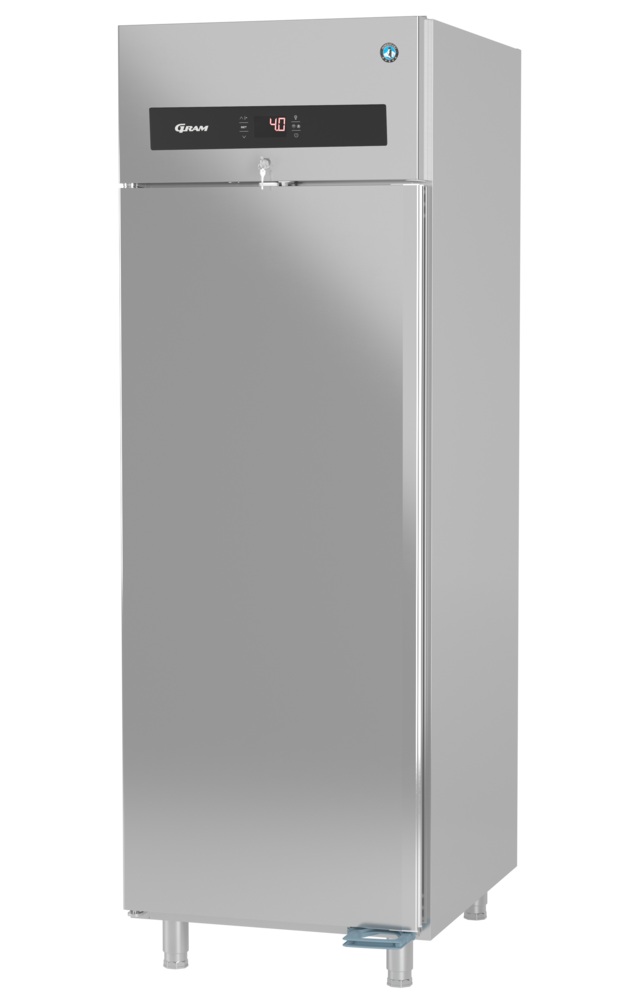Vendbar dør med lås, selvluk funktion og fodpedal døråbner. Magnetiske og aftagelige tætningslister. LED-lys. Inklusiv 4 stk. grå PE-coatede trådhylder (530x650 mm). Formstøbt vægskinnesæt plads til 22 stk. trådhylder. Tipsikring på hylderne. Runde hjørner indvendigt. Automatisk afrimning og genfordampning af tøvand. Super effektivt luftledesystem. Temperaturområde: +2/+12°C. Kølemiddel: R600a. Klimaklasse 5. Lydniveau: 48 dB(A). Ben (H): 130-180 mm
