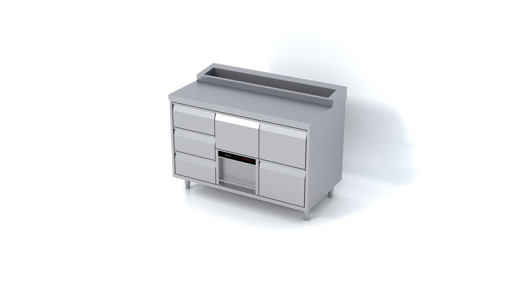 Med kølebrønd for kantiner. Alle låger/skuffer er med 50 mm isolering og selv-luk.Leveres frit justerbare ben 10-50 mm.Temperaturområde: -5°C/+8°C
