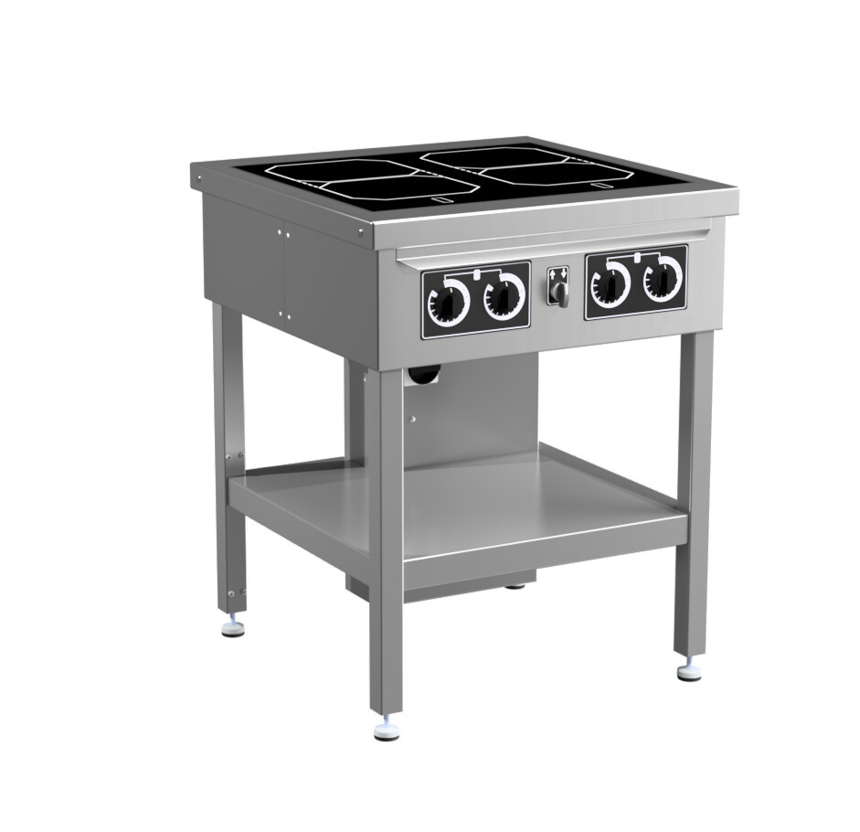 Kogebord til semiprofessionelt brug. Kompakt og solid konstruktion. Overplade type: 6 mm tyk glaskeramisk. Ottekantede kogezoner med én effekt på hver 2,1 kW der måler 18x22 cm. Rustfri underhylde. Stativ i rustfrit stål. Fedtfilter i rustfrit stål. Automatisk sluk af kogeplade. Gryde sensor som automatisk til og frakobler varmen. Overophedningsbeskyttelse. Opvarmning med automatisk boost. Restvarmeindikator. Mulighed for sammenkobling imellem forreste og bagerste kogezone. Funktion til spærring af betjening (Børnelås-funktion). Varmeregulering med drejeknap: 9-trins regulering med boost. Betjeningspanel leveres med 3 fast temperaturindstillinger: 44-64-94 °C. Høj varmeeffekt sikrer hurtig opvarmning. Elektronisk hæve/sænk funktion i benene fra 800-1000 mm højde.