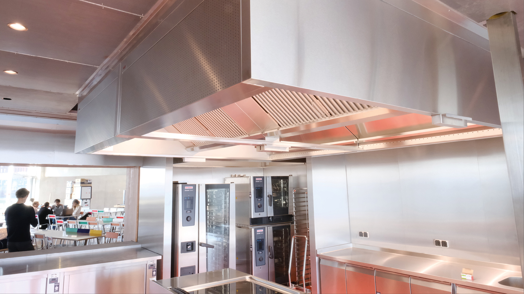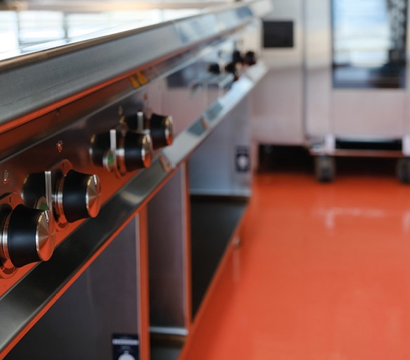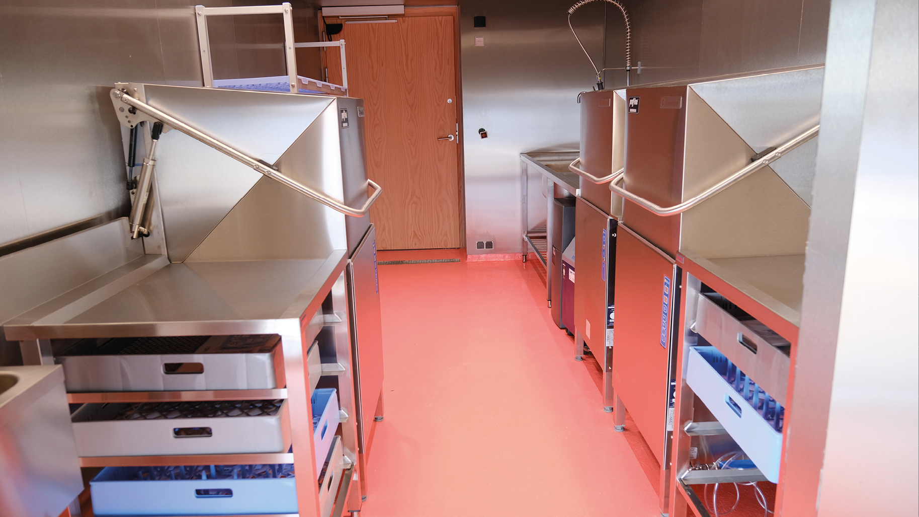 Foruden det rent funktionelle har der også været en arkitektur, som køkkenet skulle spille sammen med, og køkkenet, der er i stål hele vejen fra ovne til bordplader og vægge, får iøjnefaldende modspil i det røde epoxygulv, der er gennemgående i såvel køkken som opvask.