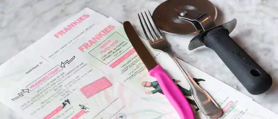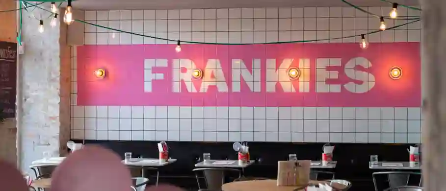 Et besøg på FRANKIES PIZZA er alt andet end kedeligt. Oplevelsen starter allerede ved indgangen, hvor navnet står bøjet i neonrøde versaler - og det farverige udtryk fortsætter i restauranten, hvor skrigende pink og lyserød går igen og blander sig med den rå og uformelle indretning.