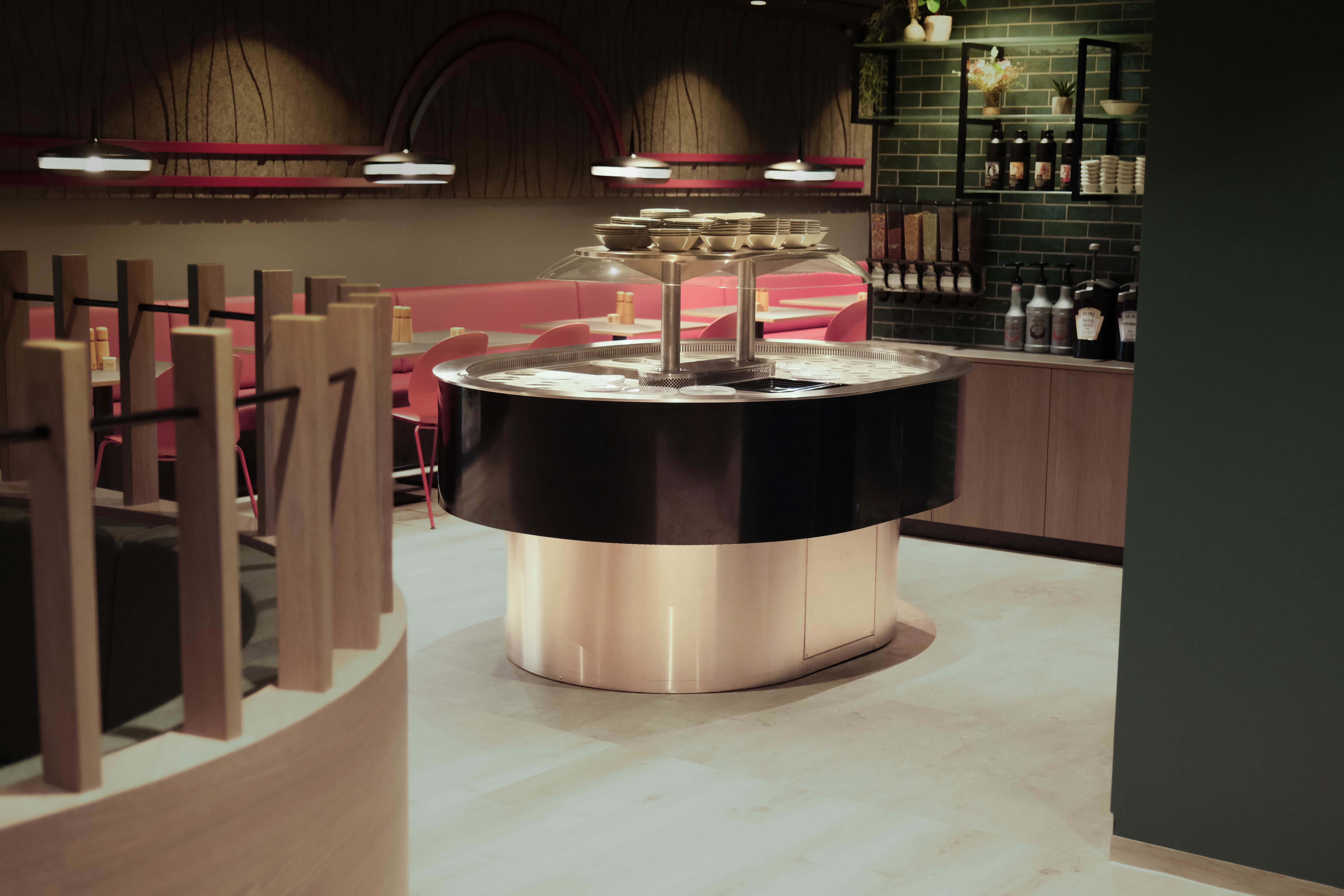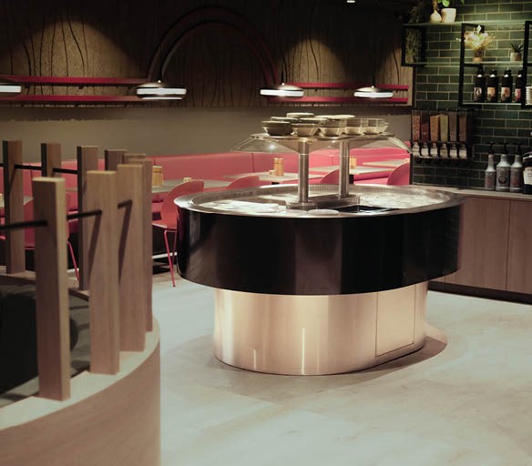 Også salatbaren er specialfremstillet og er en smart oval model, der passer pænt ind i den øvrige indretning.