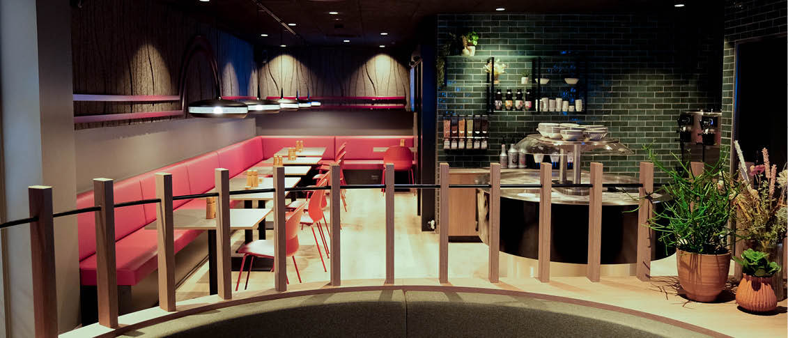 Og dét har de fået med Larsens Sportsbar & Bistro, hvor alt er gentænkt fra farven på væggene til møbler og menukortet, der i bedste sports-barstil matcher den uhøjtidelige stemning og lokker med blandt andet burgere, ribs og hotwings – og oplevelsen starter allerede ved indgangen. Her skaber et frodigt grønt kunstværk med restaurantens logo blikfang, og lækre polstrede stole i rosa nuancer indbyder til at slå sig ned og f.eks. nyde en cocktail, en fadøl, en lemonade fra Rebæl eller en milkshake fra Ryå Mejeri.