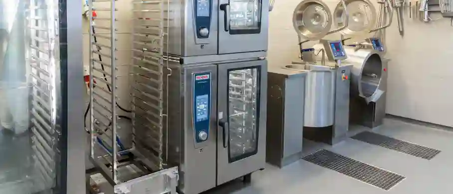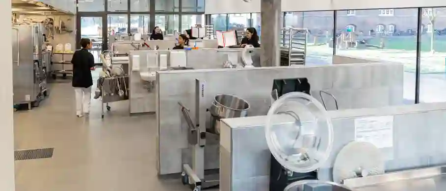 ”Halvmurene er samtidig med til at afgrænse de forskellige arbejdsfunktioner, så det er tydeligt, hvor henholdsvis rå og forarbejdede grøntsager bliver håndteret, ligesom bagning, og tilberedning af den kolde mad, der kræver pålægsmaskine og så videre er adskilt fra vippegryderne og den varme mad”, forklarer projektleder fra Brønnum, Tommy Ebsen.