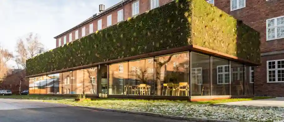 ”Ønsket var at højne hverdagslivet og fremme appetitten med frisk mad, og ikke mindst at forkorte transporttiden fra produktion til mund. Vi har desuden arbejdet rigtig meget med, at maden ikke kun skal kunne duftes men også føles på og ses med egne øjne,” fortæller projektleder i Københavns Kommune, Sachiko Hemmi. Hun henviser til byggeriets transparente udtryk, der er skabt med store glaspartier både ud mod den omgivende natur men også mellem opholdsrum og køkken, hvor beboerne er velkomne til at sidde og følge med i, hvad der foregår i køkkenet, der har kapacitet til 114 på fuldtidskost.