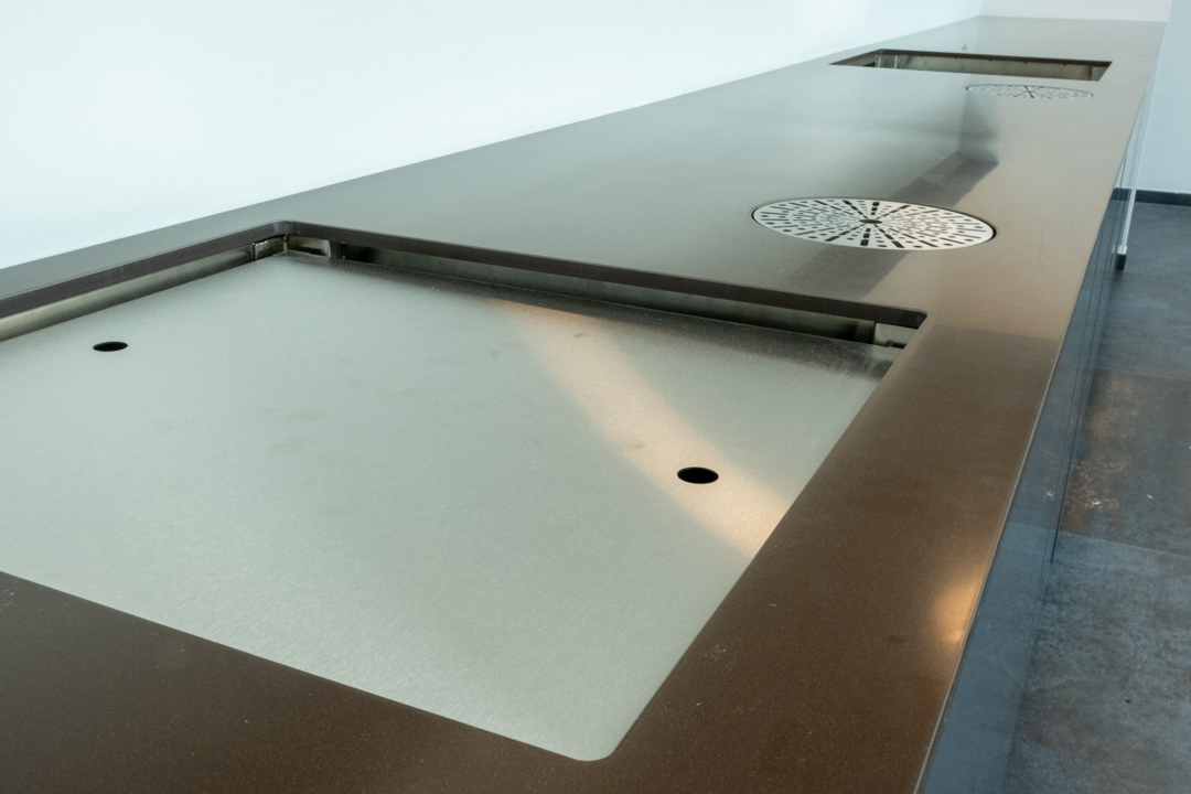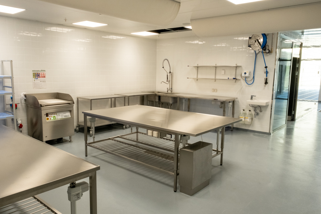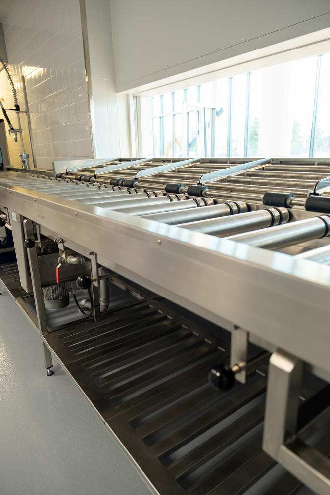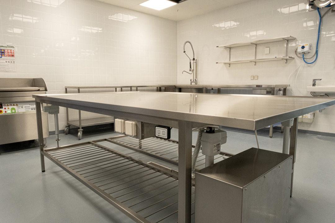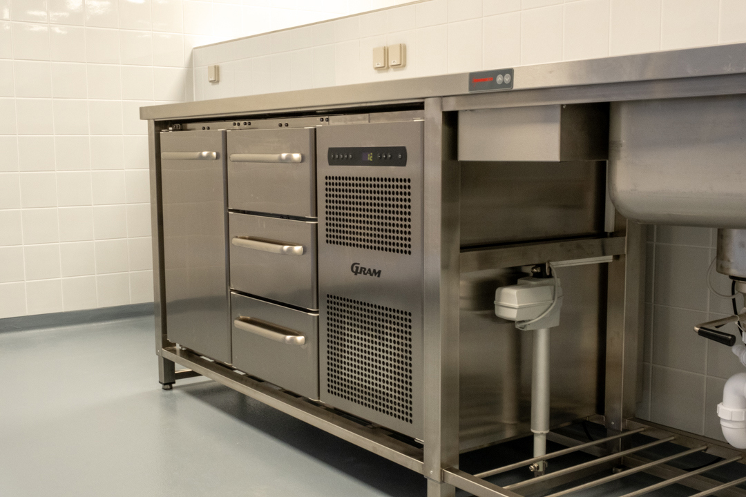 Og apropos smarte løsninger, er der indtænkt praktisk hyldeplads ud for de enkelte arbejdsstationer, hvor alt er indenfor rækkevidde, så køkkenpersonalet ikke skal gå en masse unødige skridt. En anden praktisk løsning er vandslangerne, som selv ruller op, så man slipper for at gøre det manuelt. De er placeret på væggen og tilkoblet et doseringssystem, så mængden af sæbe doseres alt efter, om der er tale om let eller grov rengøring af de grå epoxygulve, som rulleborde og lignende kører glat hen over uden de gentagne stød op i kroppen, et flisegulv kan give.