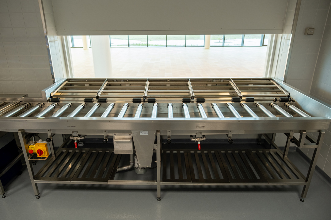 ”Vi ville gerne have en løsning, hvor vi kunne minimere antallet af løft, og vi har valgt en tunnelmaskine fra Wexiö”, fortæller Mette om opvaskemaskinen, hvor hele afrydningssystemet er fuldt automatiseret. Det betyder, at rullerne, der flytter opvasken, er motoriserede, og når man trykker på en udløserknap, kører kurvene, som gæsterne i kantinen selv har fyldt med glas, bestik og tallerkener, automatisk over på afrydningsrullebanen, og derfra kører kurvene direkte ind i forskyllemaskinen, uden at man behøver at røre ved noget.